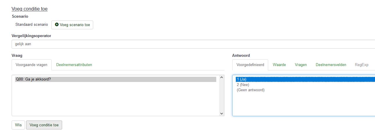 (Q1 staat voor de vraagcode van de vraag. Zoals eerder uitgelegd kun je de vraagcode zelf verzinnen, maar let erop dat die overeenkomt met de code van de informed consent vraag). Deze conditie betekent dat deze vraaggroep alleen getoond wordt als iemand Ja antwoordde op Q1.