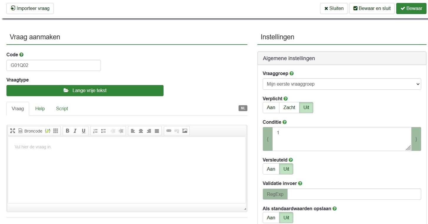 Direct onder de kop ‘Vraag aanmaken’ zie je drie opties waar je informatie kunt toevoegen. De eerste is een venster getiteld Code waar je een (handige) code aanmaakt voor de vraag. Bijv. Leef als de vraag over leeftijd gaat of Leef1 als je meerdere vragen over leeftijd gaat stellen.