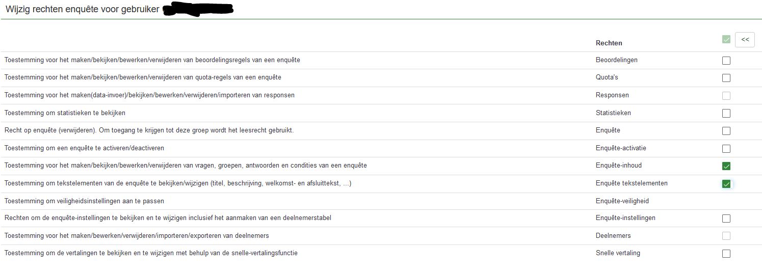 - Snelle vertaling (“Quick translation” in de Engelse LimeSurvey): Deze rechten kun je een student waarschijnlijk veilig geven (hoewel het in de praktijk maar zelden zin zal hebben).