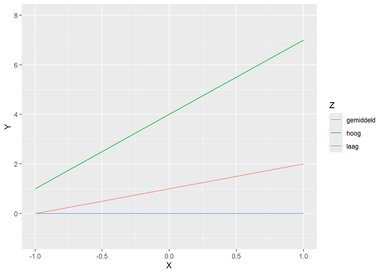 Hierbij is \(XZ\) het product van de twee variabelen \(X\) en \(Z\). Om nu te zien hoe het verband tussen X en Y afhangt van Z, kunnen we deze formule herschrijven als