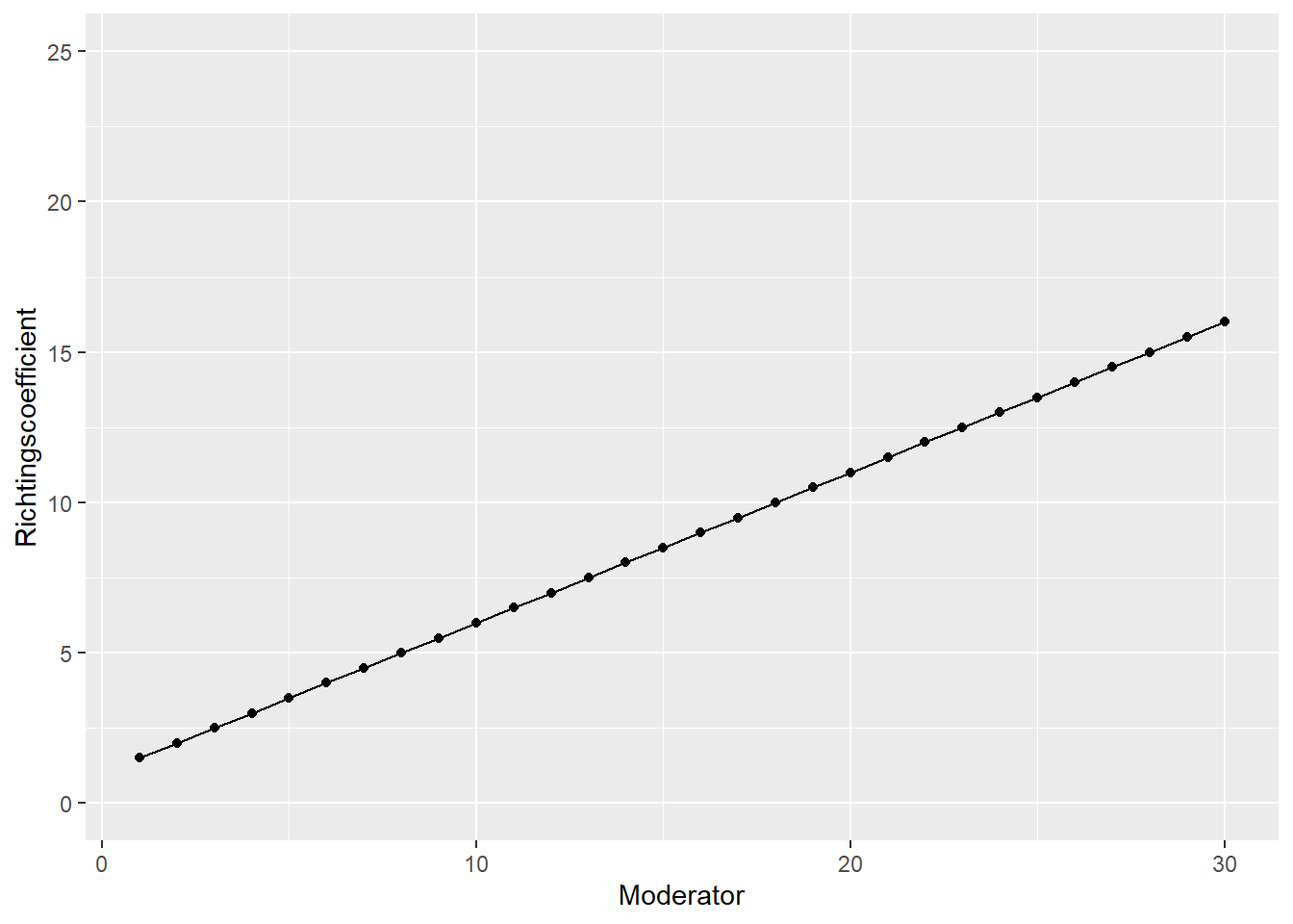 In deze figuur staan op de horizontale as de waarden van de moderator en op de verticale as wat de bijbehorende richtingscoefficient wordt als \(b_1 = 1\) en \(b_3 = 0.5\). De richtingscoefficient is dus lineair afhankelijk van \(Z\). Uit deze figuur lezen we af dat bij de waarde van de moderator van bijvoorbeeld \(Z = 8\) een richtingscoefficient (verband tussen X en Y) hoort van \(5\) en bij \(Z = 28\) hoort een richtingscoefficient van \(15\). Op deze manier kan dus een figuur zoals figuur Figuur 12.2 worden gemaakt voor willekeurige waarden van de moderator. Merk op dat, als er geen moderatie is, dus \(b_3 = 0\), dat dan de punten allemaal op een horizontale lijn liggen. De richtingscoefficient van X is dan altijd hetzelfde, ongeacht de waarde van \(Z\).