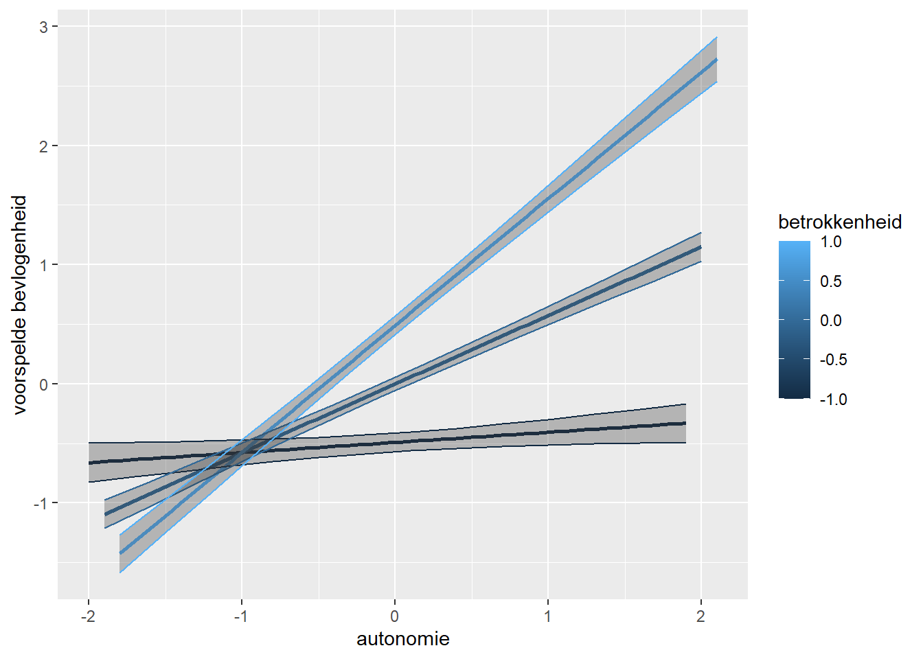 De interactieterm kan aan het regressiemodel worden toegevoegd door de extra term betrokkenheid*autonomie op nemen, die het product is van deze variabelen. Om de interpretatie van het interactie-effect gemakkelijker te maken, zijn alle variabelen gestandaardiseerd, dat wil zeggen dat van de oorspronkelijke variabele het gemiddelde wordt afgetrokken (net als bij centreren) en dat deze gecentreerde variabele wordt gedeeld door zijn standaardafwijking. Een gestandaardiseerde variabele heeft (dus) een gemiddelde van \(0\) en een variantie (en standaardafwijking) van \(1\). Alle variabelen zijn na standaardisatie gemeten in standaardafwijkingen! Dat wil zeggen: één eenheid in autonomie omhoog, betekent één standaardafwijking (SD) in autonomie omhoog. De waarde +1 van een gestandaardiseerde variabele correspondeert met een score die 1 SD boven het gemiddelde ligt en de waarde -1 met een score die 1 SD onder het gemiddelde ligt. Het maakt bij gestandaardiseerde variabelen niet uit waarin de oorspronkelijke variabelen zijn gemeten (euro’s, centimeters, kilo’s, of een psychologische schaal), want na standaardisatie zijn alle variabelen gemeten in dezelfde eenheid (namelijk standaardafwijkingen) en zijn daardoor dus goed vergelijkbaar.